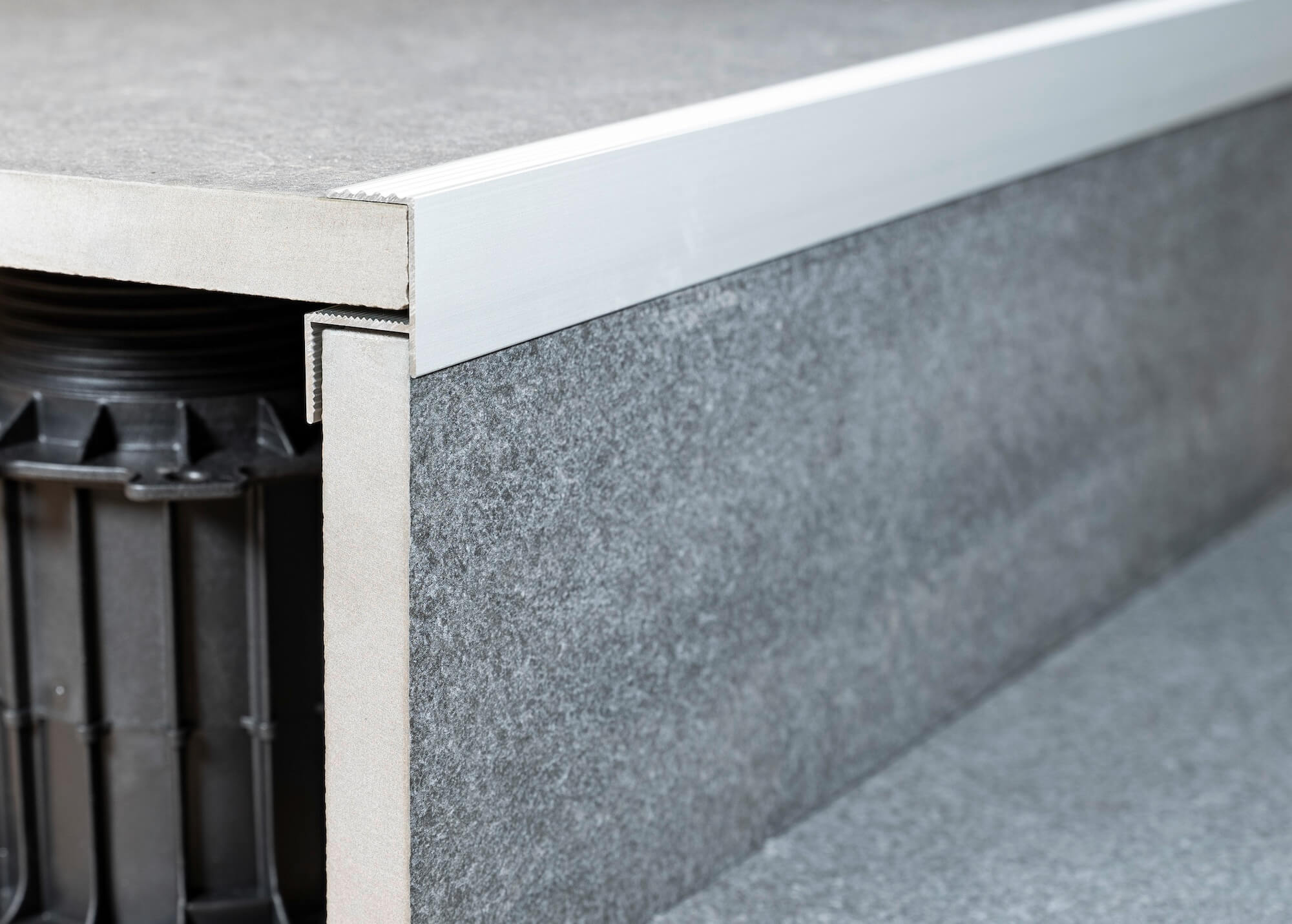 The RELO RA edge finishing trim profile is the perfect finishing touch and design feature for any terrace made of wood, wood-like materials or ceramic tiles.